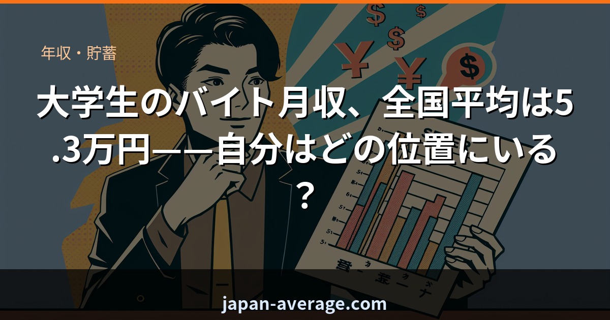 全国大学生協連合会の学生生活実態調査によると、大学生のバイト月収の平均は約5.3万円。ただしこの数字には、テスト前の「今月ほぼゼロ」という月も、夏休みに稼ぎまくった月も全部混ざって出てきた平均値に近い。年間を通した実態を月換算した数字、と思って見た方がいい。